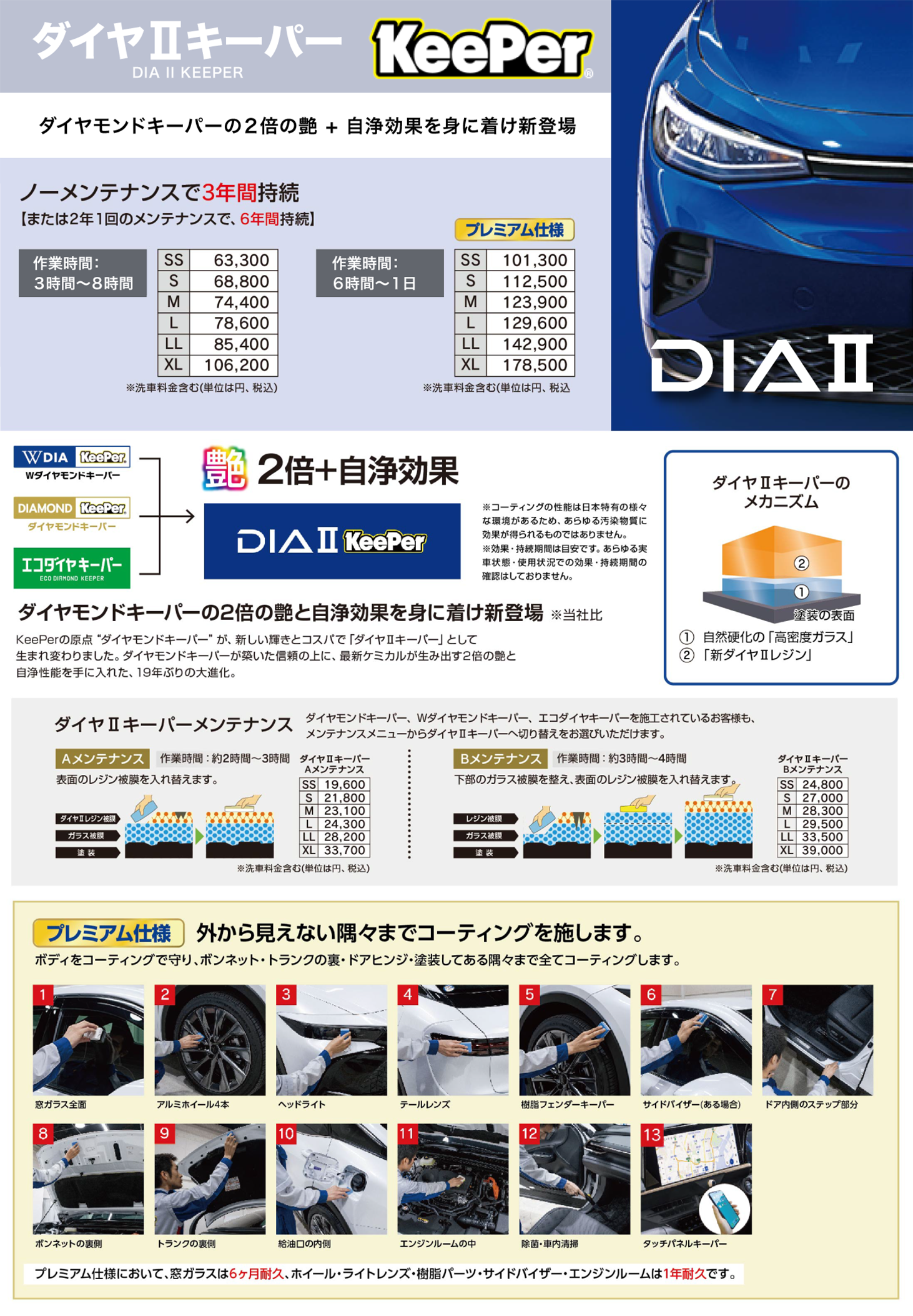 ダイヤモンドキーパーの2倍の厚み。ダブルダイヤモンドキーパープレミアムは、ガラス被膜だけでも2層、きちんと乾燥させながら施工します。